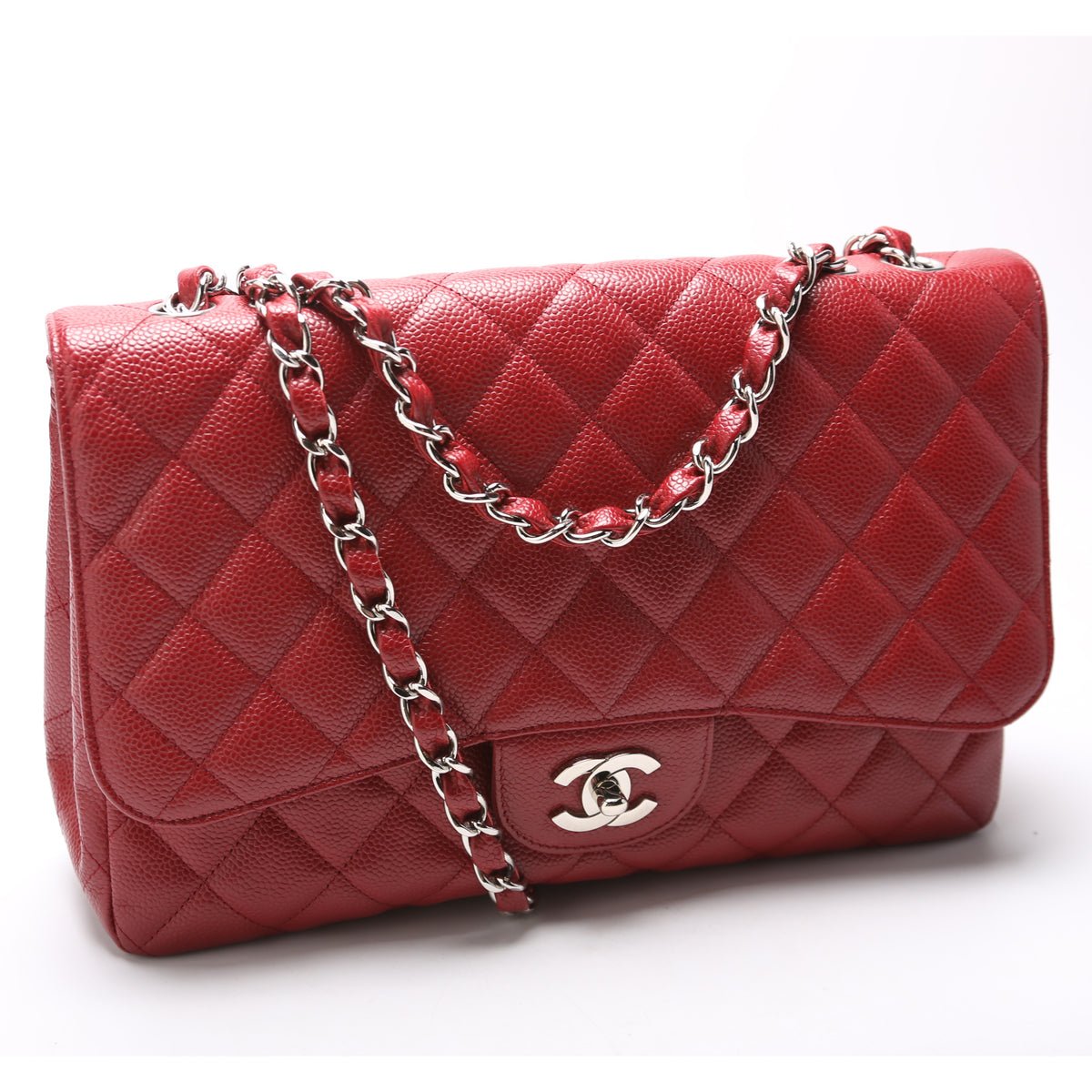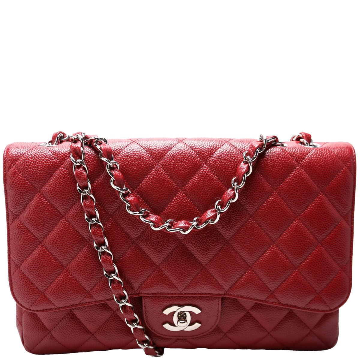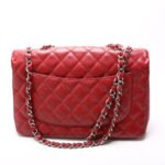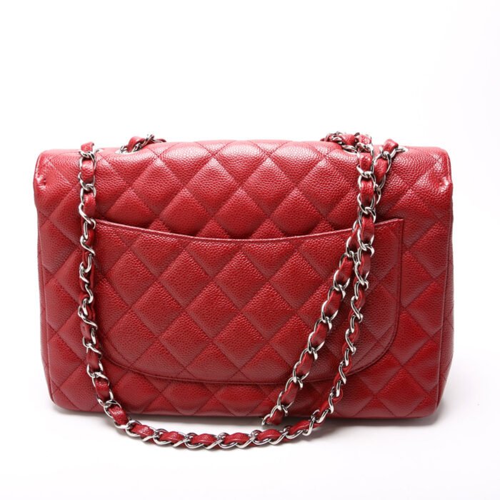 This pre-owned Chanel Classic Flap Jumbo is guaranteed 100% authentic. The exterior is in the classic Chanel Caviar leather.